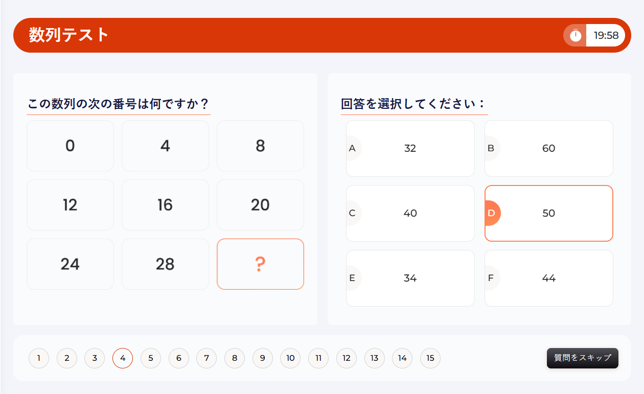 数字の並び方のパターンを見つけて予測する能力を試す、数列テスト問題に挑戦しましょう。